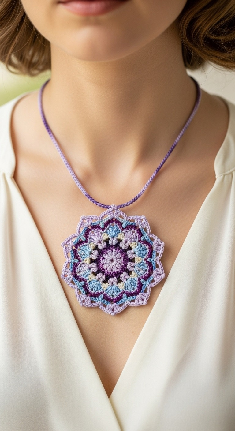 Handmade jewelry holds a special charm, and this crochet mandala necklace is no exception. Personalize it with your favorite color palette to match your style or create a thoughtful, unique gift for a loved one. Each stitch woven with care transforms simple threads into a wearable work of art, allowing you to express your individuality and passion for slow craft.