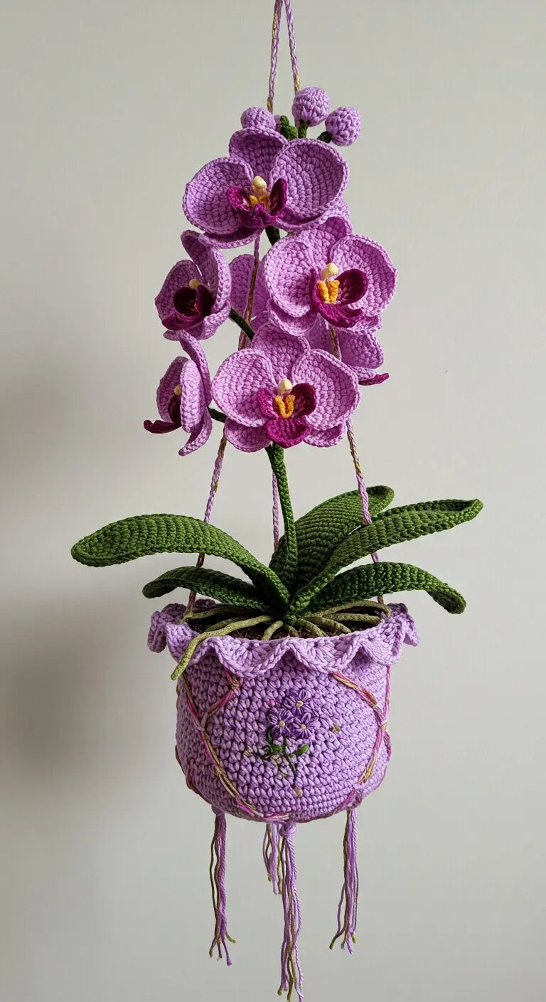 This full-bodied crochet orchid design boasts several blooms and wide green leaves, displayed in a hanging pot accented with tiny purple flower appliqués.