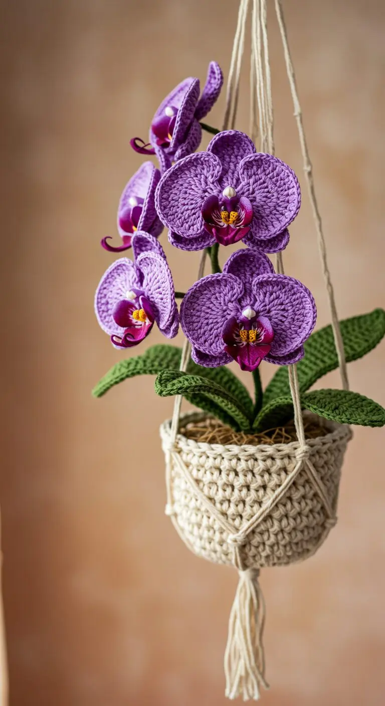 Three-Bloom Crochet Orchid in Boho Hanging Pot