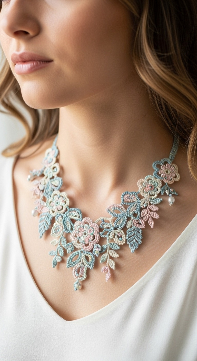 There’s a unique joy in crafting something truly beautiful with your own hands. This Irish crochet necklace isn’t just a piece of jewelry; it’s an heirloom in the making, a testament to skill and patience. Imagine the compliments you’ll receive wearing this intricate floral design, or gifting it to a loved one. The delicate lace work and soft pastel colors make it a versatile accessory that brings a touch of vintage charm and sophistication to any ensemble.