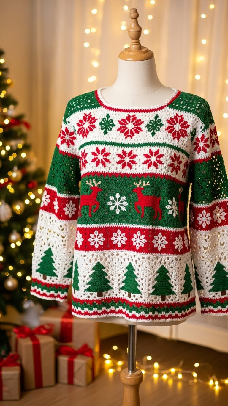 This stunning display captures the essence of holiday cheer with a meticulously crocheted Christmas sweater. Its vibrant green, red, and white hues are adorned with traditional festive motifs like snowflakes, reindeer, and evergreen trees. Such a charming garment instantly evokes feelings of warmth and joy, perfect for any seasonal celebration. The intricate patterns highlight the artistry involved in creating a unique Christmas sweater that stands out.
