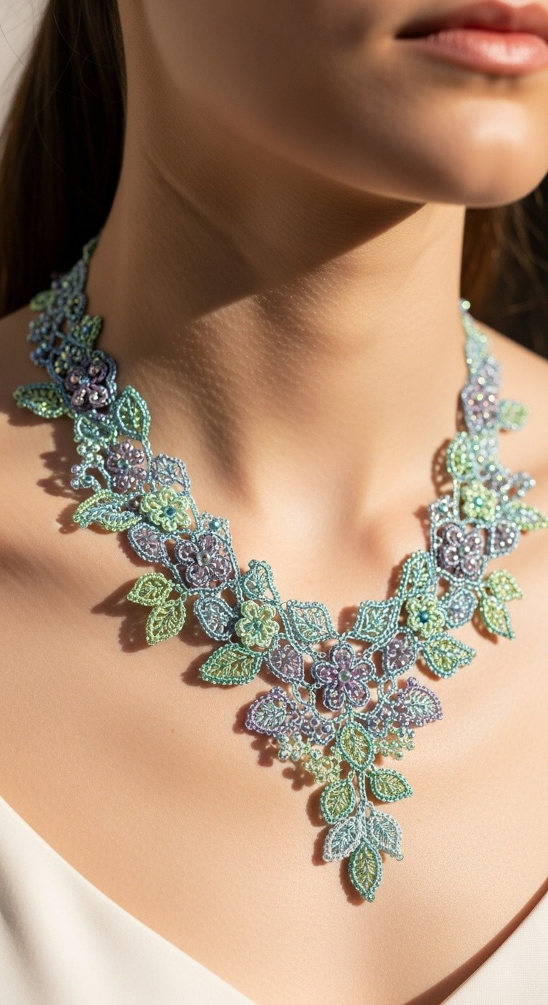 Dive into the delicate art of lace crochet with this enchanting floral necklace pattern. Inspired by whimsical woodland blooms, this piece combines intricate stitches with sparkling seed beads to create a wearable work of art. Perfect for adding a touch of natural elegance to any outfit, this necklace is a beautiful statement piece for spring and beyond.