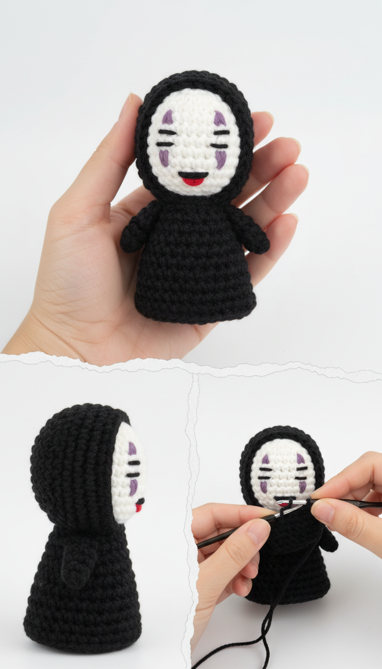 Step into the mystical world of Spirited Away with this captivating No-Face amigurumi pattern! Known for his quiet demeanor and striking appearance, No-Face makes an intriguing addition to any fan’s collection. This easy-to-follow guide will help you craft your very own charming rendition of this iconic character, perfect for display or gifting.