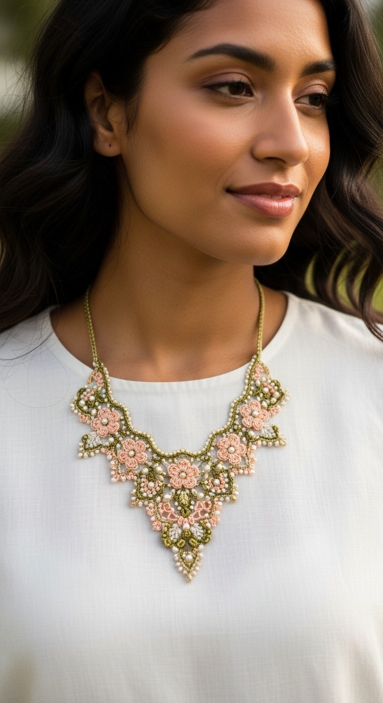 Elevate your style with our exquisite Floral Lace Crochet Necklace pattern. This stunning piece, adorned with delicate pink blossoms and shimmering beads against a backdrop of sage green lace, is perfect for adding a touch of vintage elegance to any outfit. Create a unique, handcrafted accessory that truly stands out.
