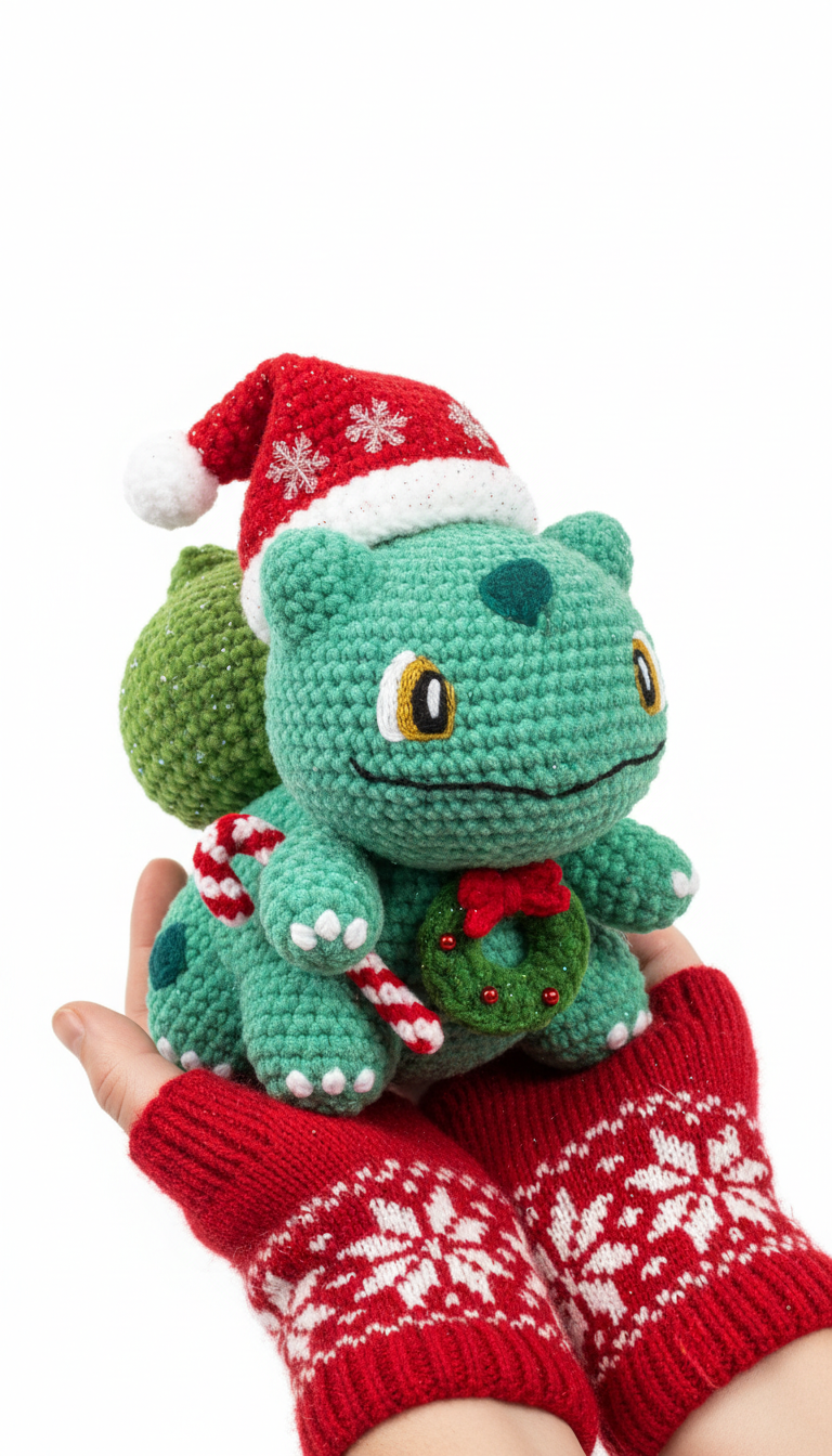 Get ready to catch ’em all this holiday season with an adorable, festive twist! This free crochet pattern will guide you through creating your very own Christmas Bulbasaur amigurumi. Perfect for gifting to a Pokémon fan or adding a charming, handmade touch to your holiday decor, this little guy, complete with a Santa hat and mini wreath, is sure to bring joy.