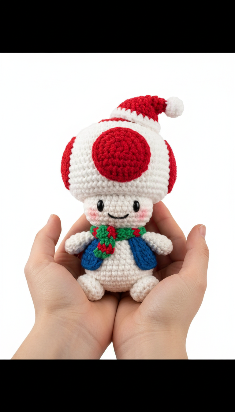 Bring a touch of Super Mario holiday cheer to your home with this adorable Christmas Toad amigurumi! Perfect for fans of the classic game, this festive little mushroom pal, complete with a Santa hat, vest, and cozy scarf, makes a delightful decoration or a thoughtful handmade gift. Get ready to crochet your way to a super-cute holiday season!