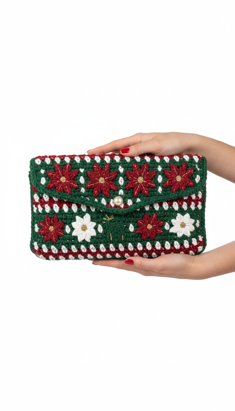 Embrace the spirit of the season with this stunning festive crochet poinsettia clutch! Featuring rich holiday colors, delicate flower appliques, and subtle gold accents, this clutch is the perfect accessory for any holiday party or a thoughtful handmade gift. Its unique design and elegant pearl button closure make it a true statement piece that will surely draw compliments.