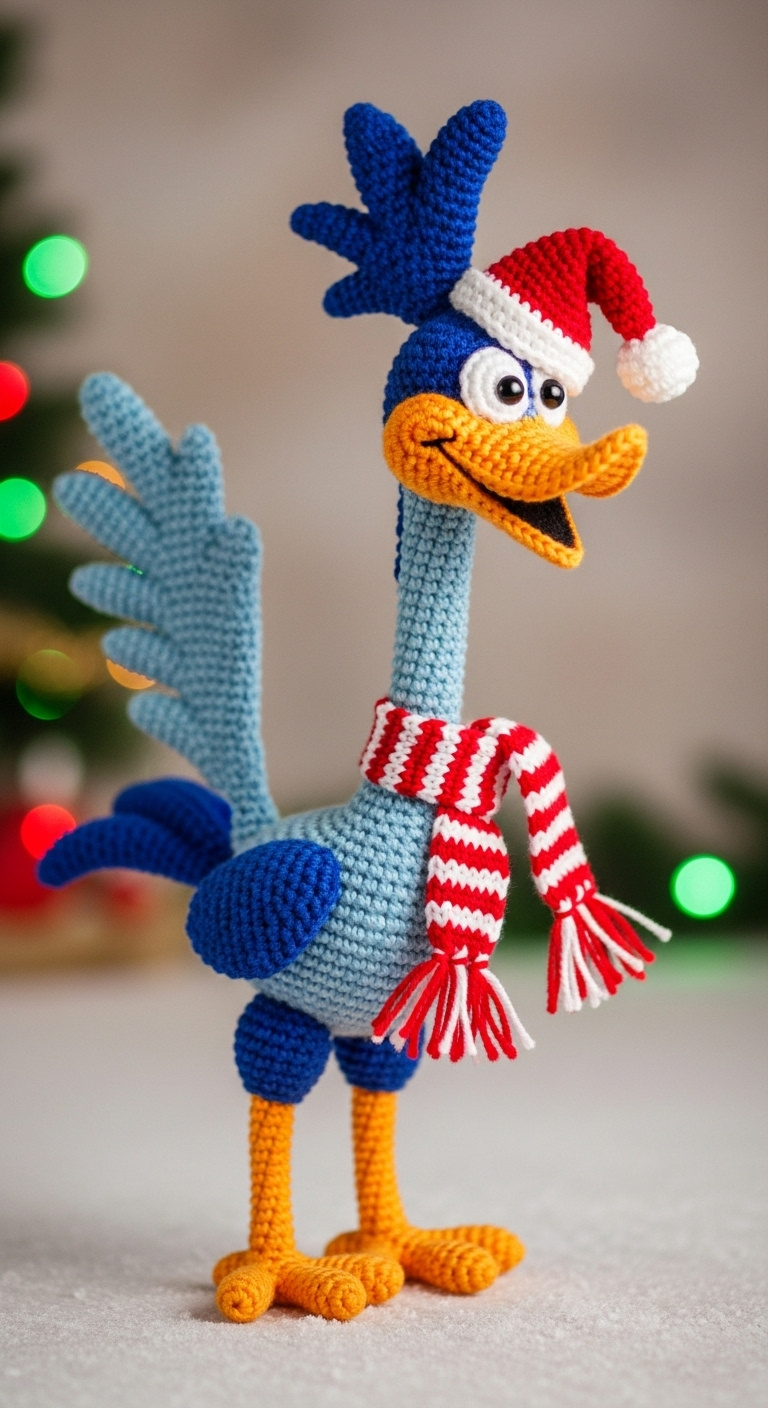 Beep beep! This charming crochet Road Runner is ready for the holidays. Adorned with a classic Santa hat and a festive red and white striped scarf, this amigurumi brings a touch of whimsical cheer. The intricate crochet work highlights the iconic features of the beloved cartoon character, making it a delightful sight. It’s a perfect blend of nostalgic charm and holiday spirit, crafted with obvious care and attention to detail.