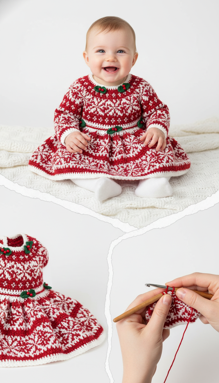 Capture the warmth and joy of the holiday season with this adorable crochet baby dress. Featuring intricate Fair Isle inspired snowflake patterns in classic red and white, and charming holly berry accents, this dress is perfect for your little one’s festive celebrations. Create a cherished handmade garment that will be a beautiful addition to any holiday wardrobe and a precious keepsake for years to come.