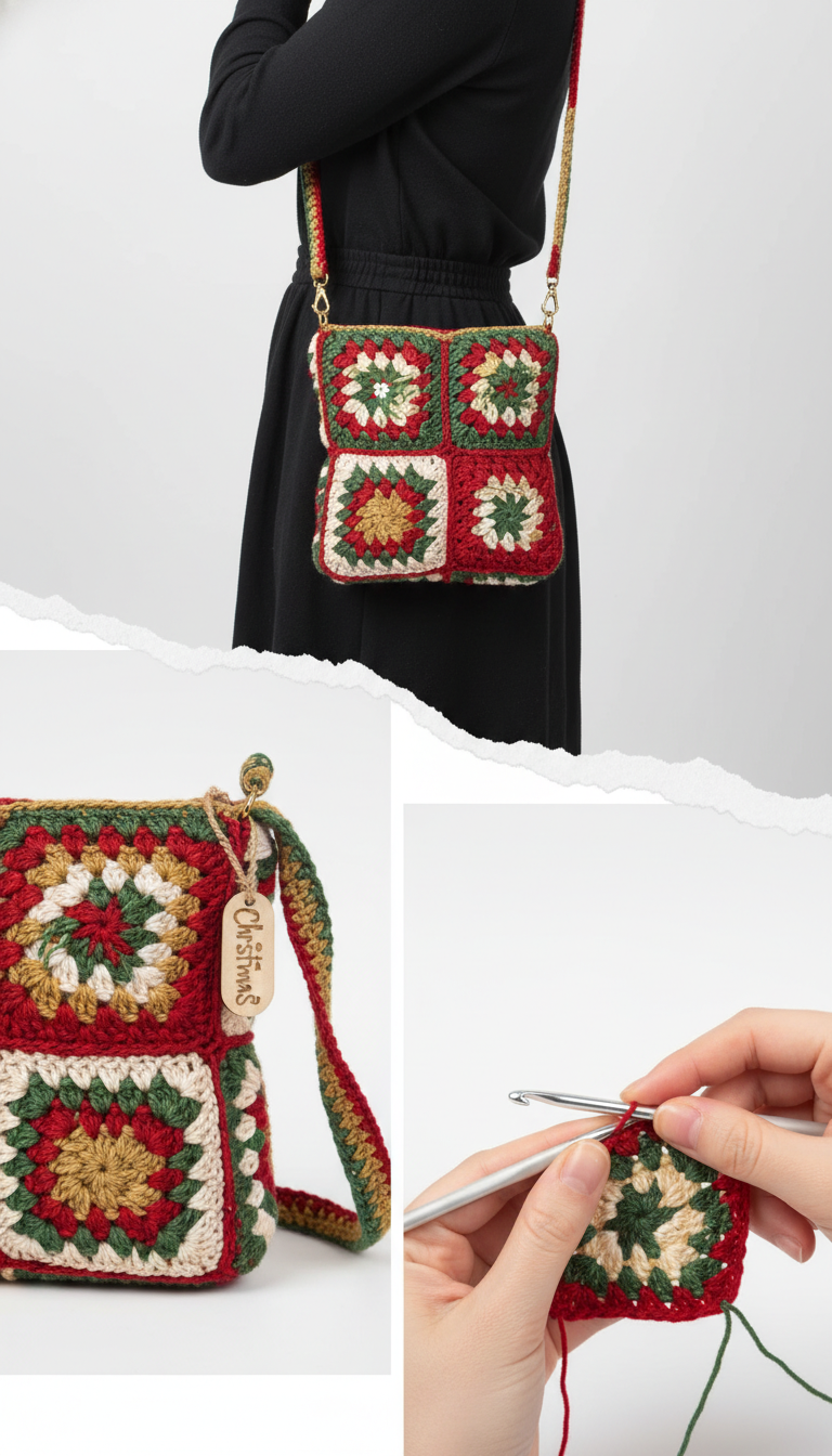 Embrace the holiday spirit with this charming crochet granny square crossbody bag! Featuring classic festive colors like rich red, deep green, creamy white, and golden yellow, this stylish accessory is perfect for adding a handmade touch to your seasonal outfits. It’s a fun and rewarding project for crocheters of all levels, making a wonderful gift or a delightful treat for yourself.
