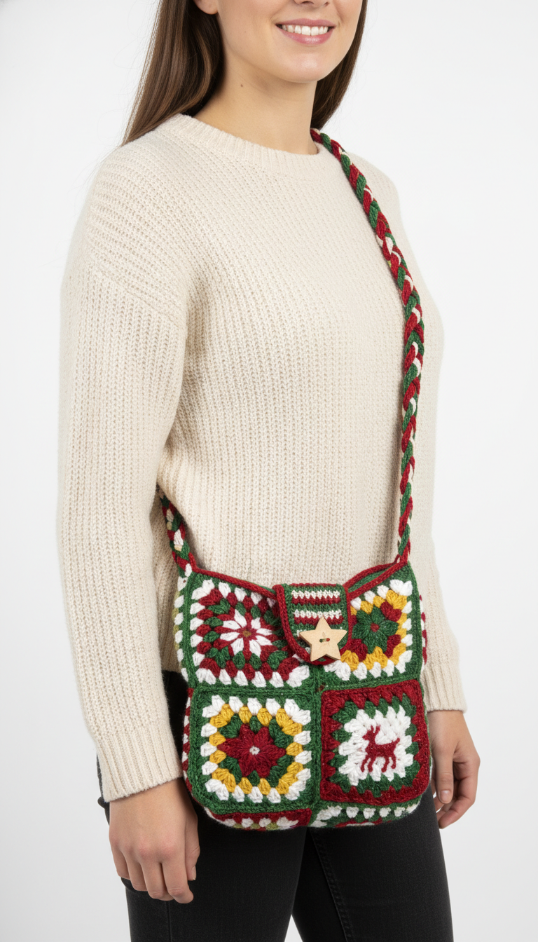 This eye-catching bag isn’t just a functional accessory; it’s a celebration of festive crafting. Its intricate granny square design, adorned with seasonal colors and a special reindeer element, makes it a true conversation starter. Imagine pairing this handmade treasure with your favorite holiday outfit or using it to carry small gifts, adding a personal touch to your celebrations.