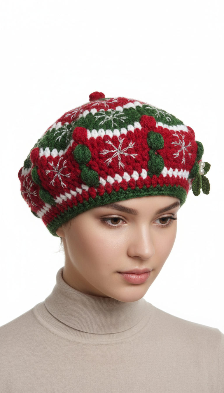 Step into the festive spirit with our enchanting Holiday Snowflake Beret! This charming crochet pattern blends classic Christmas colors with delightful textured bobbles and sparkling embroidered snowflakes. Designed to add a touch of handcrafted elegance to your winter wardrobe, this beret is not just a cozy accessory but a beautiful statement piece for any holiday gathering or crisp winter day.