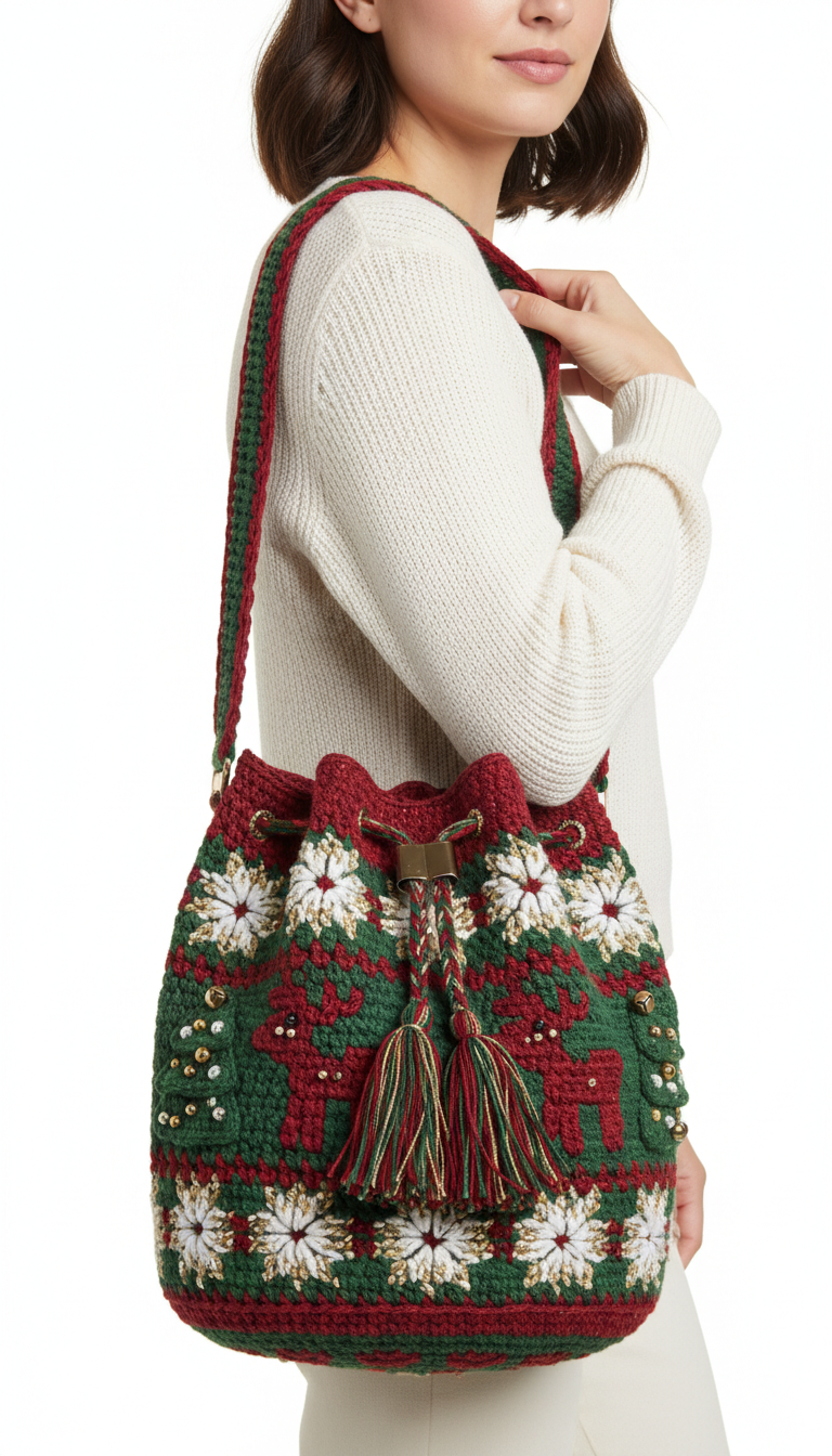 Embrace the holiday spirit with our enchanting Festive Crochet Christmas Bucket Bag! This pattern guides you through creating a stunning accessory featuring intricate tapestry crochet reindeer and delicate snowflakes. Perfect for gifting or adding a touch of festive cheer to your own wardrobe, this bag is a wonderful project for intermediate crocheters looking to expand their skills in colorwork and embellishment.