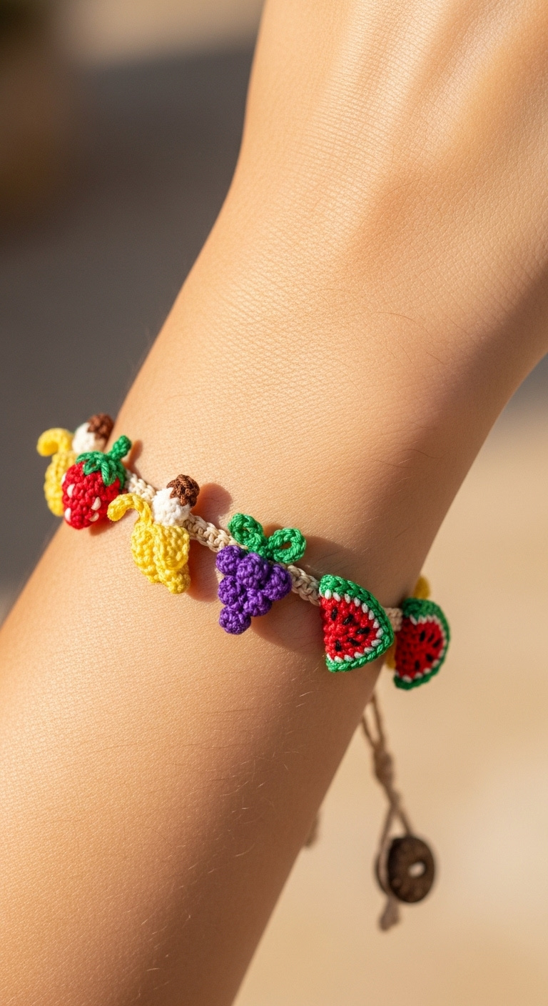 Brighten your day with this adorable crochet fruit charm bracelet! Perfect for summer, this handmade accessory features a delightful array of miniature crocheted fruits, including juicy strawberries, sweet bananas, vibrant grapes, and refreshing watermelons. It’s a joyful project that adds a touch of playful charm to any outfit and makes a wonderful personalized gift.
