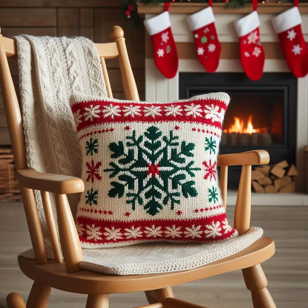 This cozy knit pillow features a timeless snowflake pattern in festive red, green, and white, perfect for the holiday season. The intricate design brings a rustic charm, evoking memories of classic Christmas décor. Set against the warm glow of a fireplace, this pillow adds both comfort and style to any living space. Whether placed on a rocking chair or couch, its soft texture and traditional motif make it a beautiful and welcoming addition to your holiday home.