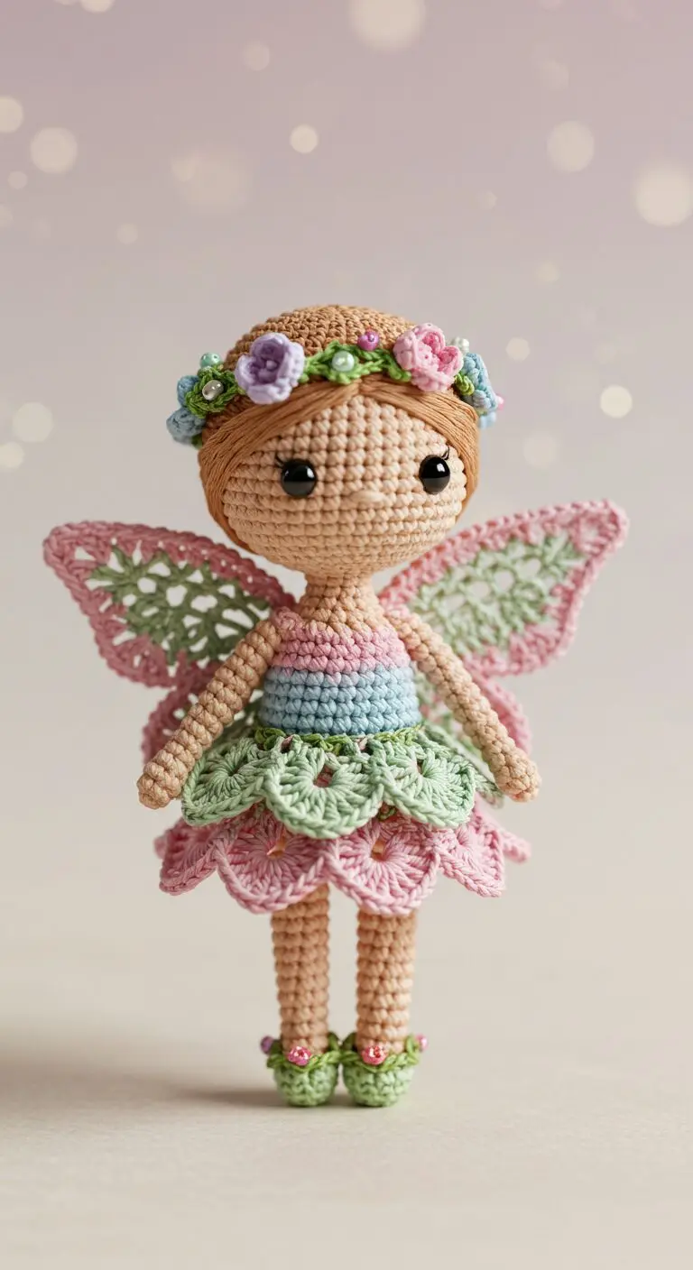 The handmade crochet fairy doll is more than just a toy—it’s a keepsake filled with love and imagination. Featuring hand-embroidered eyes, a colorful flower crown, and beautifully layered petals around the skirt, each element of this amigurumi is designed to evoke the delicate grace of woodland fairies. The soft wings, crocheted with fine thread in a lace pattern, add a dreamy touch that makes her stand out from ordinary plushies. Whether placed on a nursery shelf, used as a birthday gift, or part of a fairy tale-themed decor, this fairy doll is sure to bring smiles and spark joy.
