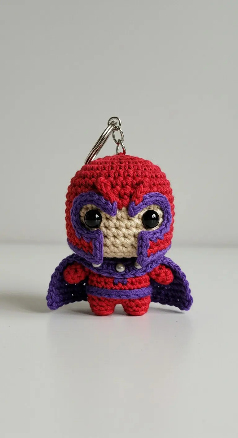 Here is a detailed, professional crochet pattern to replicate the Magneto amigurumi keychain from the image.