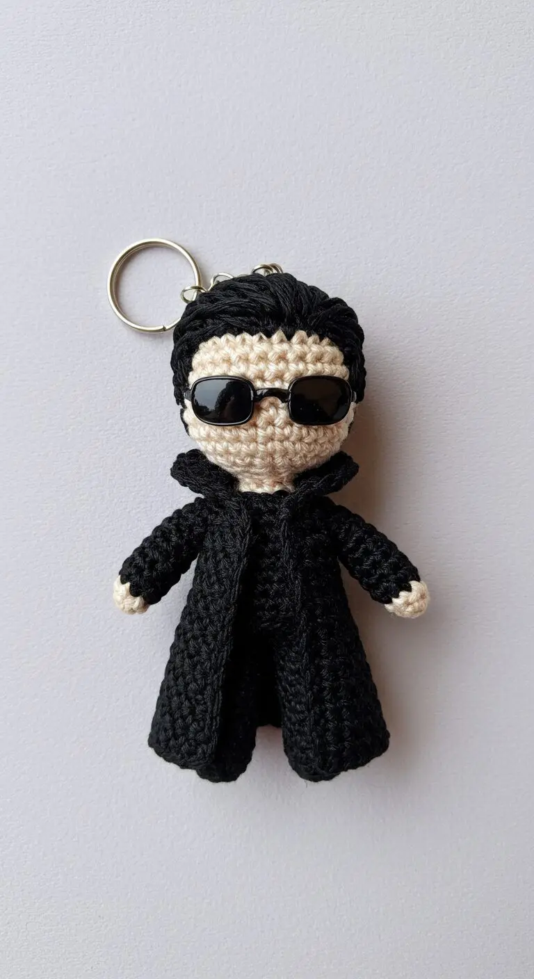 Dive into the world of ‘The Matrix’ with this adorable Crochet Neo keychain. This meticulously crafted crochet piece captures the iconic look of the film’s protagonist, complete with his signature black trench coat and cool sunglasses. It’s the perfect accessory for fans who want to carry a piece of the digital rebellion with them everywhere. This unique Neo keychain serves as a stylish tribute to a cinematic masterpiece, making it an excellent conversation starter. Whether for your keys, bag, or backpack, it adds a touch of geek chic.
