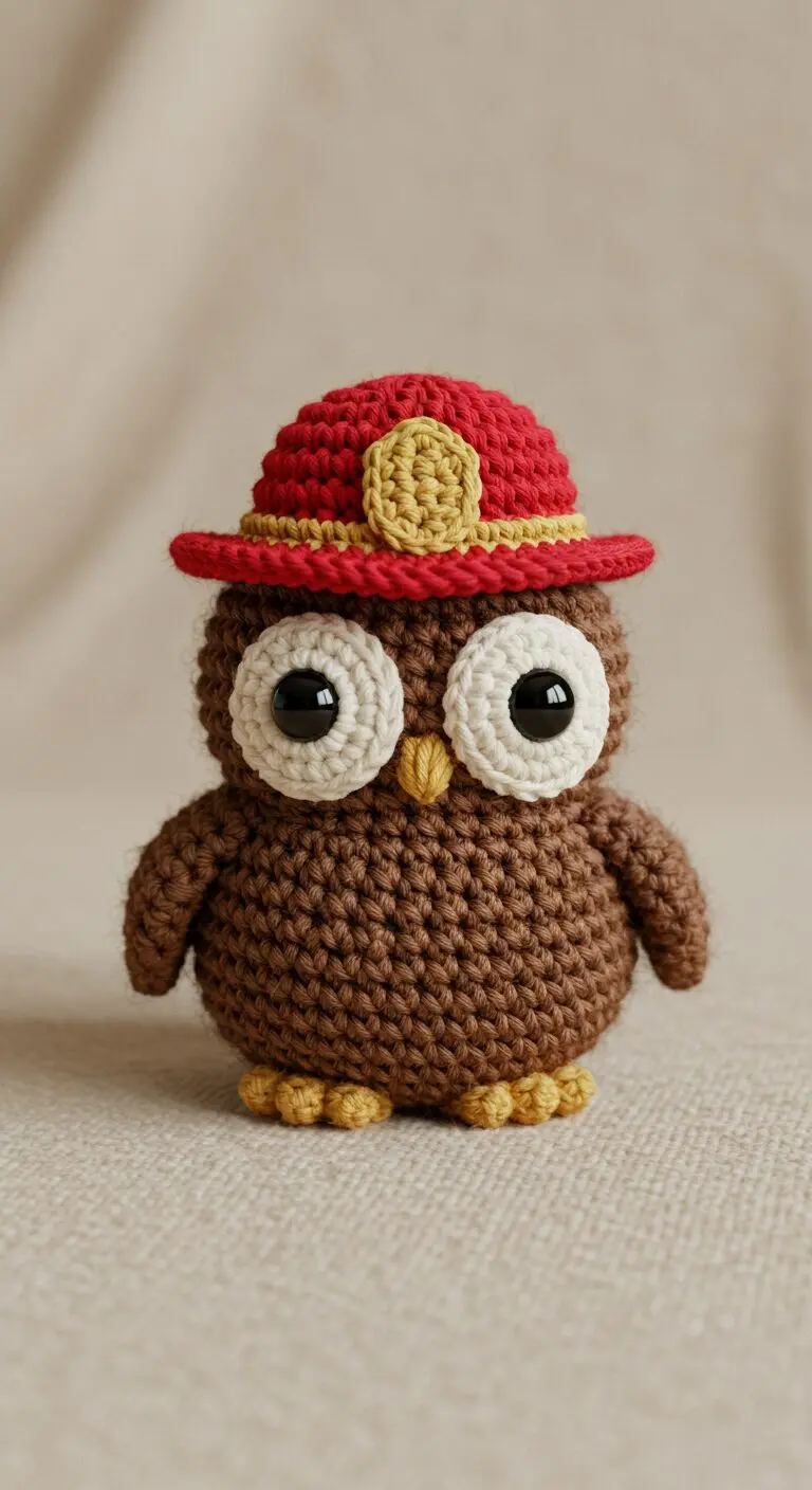 Crocheted with warmth and creativity, this adorable firefighter owl amigurumi combines charm and craftsmanship in every stitch. Made using high-quality cotton yarn, the plush owl features a rich brown body, oversized safety eyes, and a bright red firefighter hat adorned with a yellow badge detail. Its expression is both endearing and courageous, making it a unique decorative item or gift for children and adults alike. Whether you’re a crochet enthusiast or simply appreciate handmade art, this owl showcases the joyful personality and precision that amigurumi brings to life.