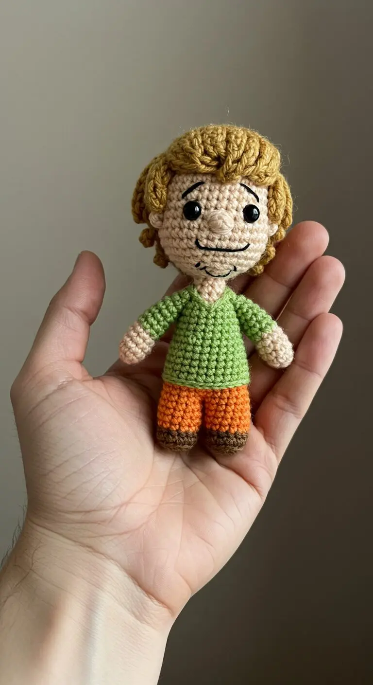 Crochet Shaggy amigurumi doll is a nostalgic and charming handmade figure inspired by the iconic Scooby-Doo character. This soft doll, made with earthy yarn tones, captures Shaggyโs carefree style with his signature green shirt and orange pants.