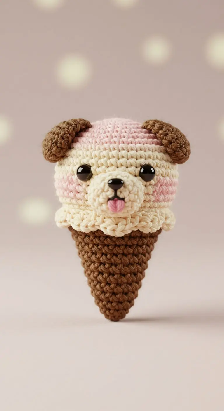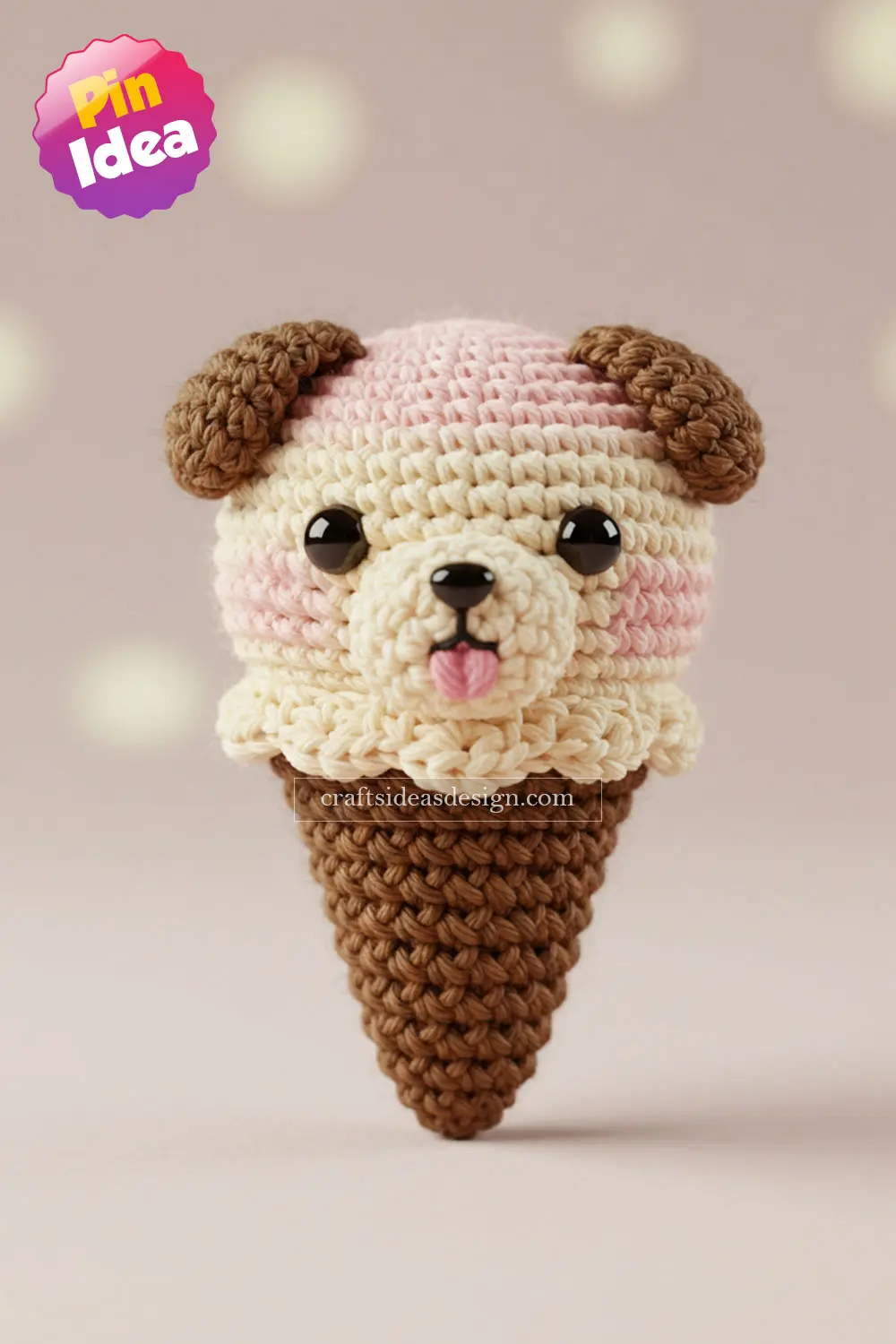 The Ice Cream Dog Crochet Amigurumi is a charming fusion of a cute canine and a delicious ice cream cone, crafted with soft yarn in shades of brown, pink, cream, and white. This adorable amigurumi features a playful dog face with safety eyes and a tongue peeking out, perched atop a textured cone, making it an irresistible addition to any crochet collection or a delightful gift for dog and dessert lovers alike.