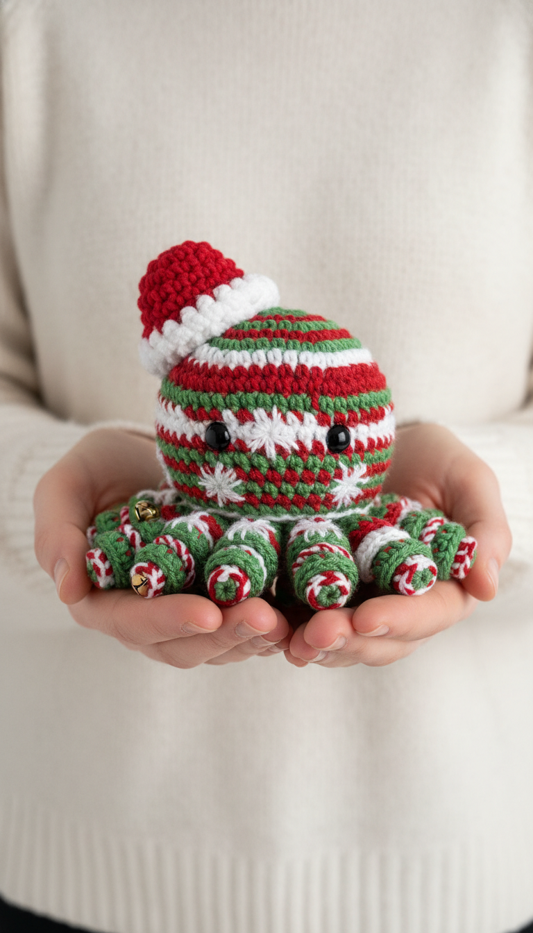 Dive into the holiday spirit with this adorable Christmas Octopus Amigurumi! Featuring cheerful red, green, and white stripes, a tiny Santa hat, and optional jingle bells, this pattern is perfect for adding a whimsical touch to your festive decor. Whether you’re making a unique gift or a charming companion, this little eight-legged friend is sure to bring joy to everyone.