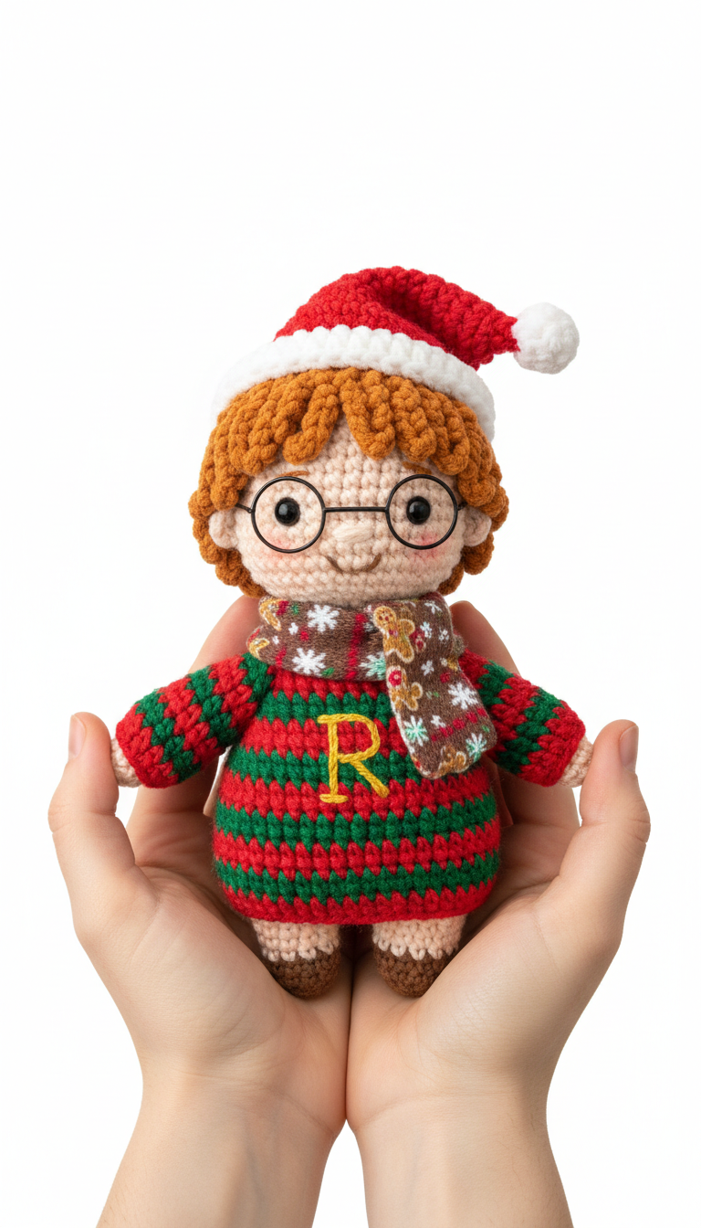 Get into the festive spirit with this adorable ginger-haired Christmas Amigurumi doll! Perfect for holiday decorating or a thoughtful handmade gift, this charming doll features a striped sweater, a cozy gingerbread-patterned scarf, and a classic Santa hat. Follow our detailed pattern to bring this special character to life and add a touch of handmade magic to your celebrations this year.