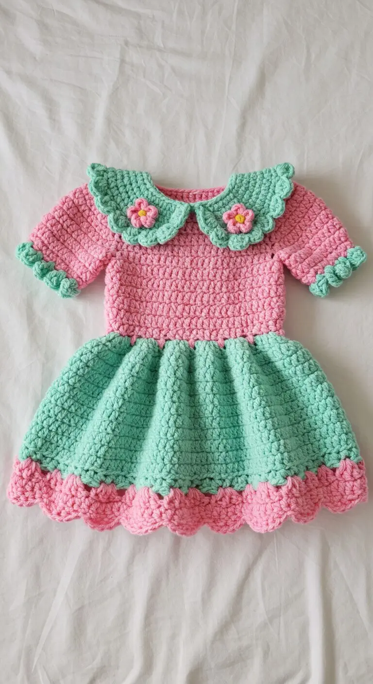 Pink, Mint, and Lilac Crochet Dress with Floral Details