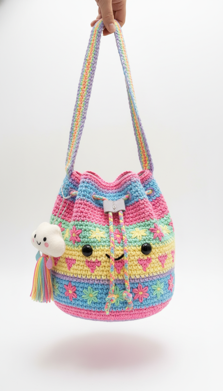 This bucket bag isn’t just a functional accessory; it’s a wearable piece of joy! Inspired by the cheerful aesthetic of kawaii, its rainbow stripes and friendly face are sure to spark happiness wherever you go. Handmade with love, it makes a wonderful gift or a special treat for yourself, showcasing your crochet skills and adding a unique touch to any outfit.