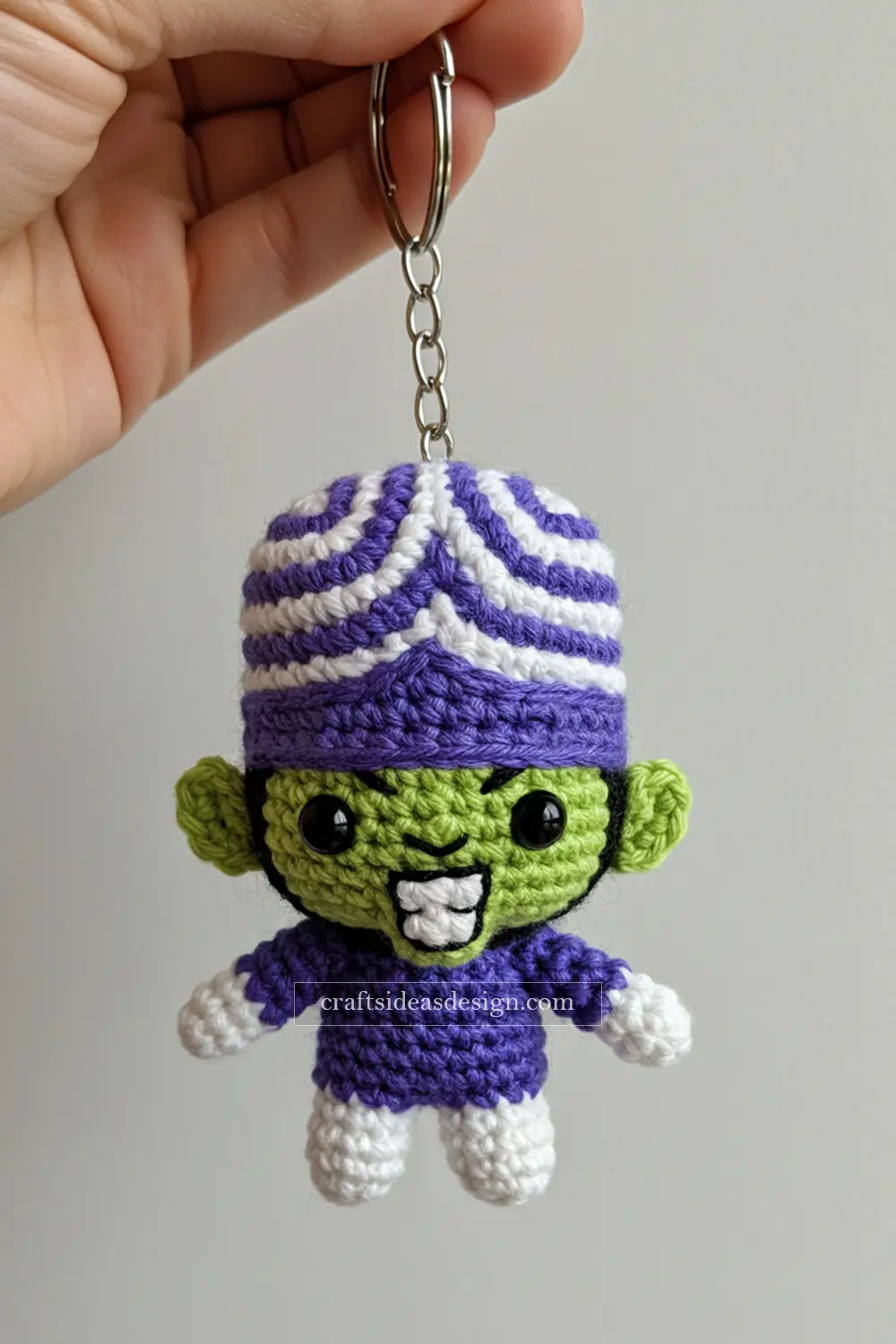 This crochet keychain version of Mojo Jojo is small in size but big in personality. Whether you’re a lifelong Powerpuff Girls fan or just love handmade character art, this piece will make you smile every time you reach for your keys. The character’s classic purple outfit, striped helmet, and expressive face are crocheted in great detail using high-quality yarn, giving it durability and charm. It’s a unique accessory that brings cartoon nostalgia into everyday life.