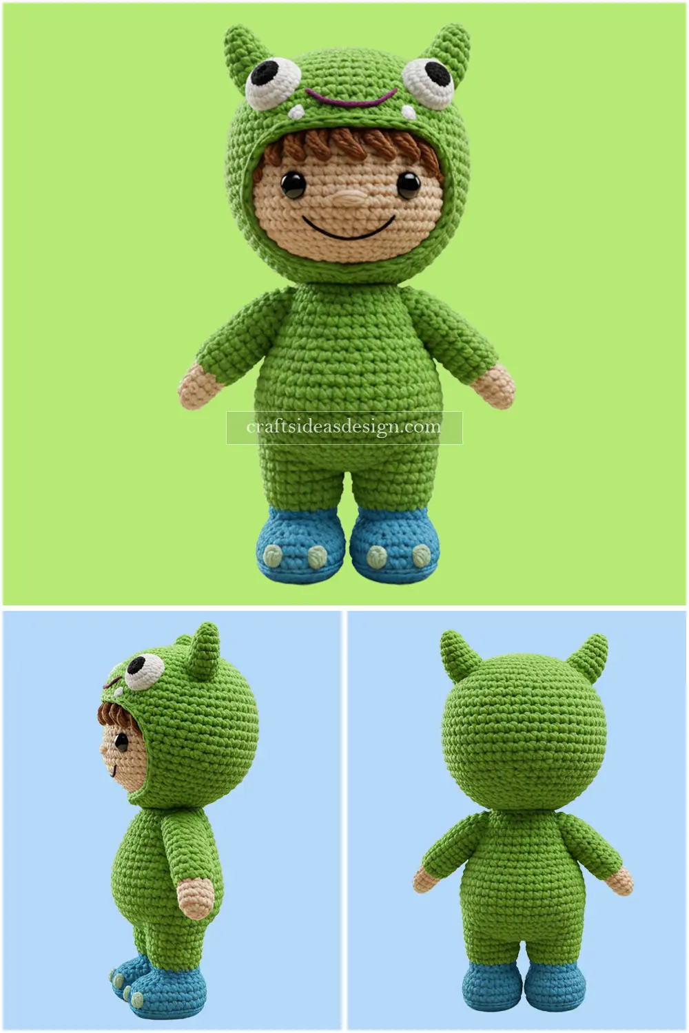 The Little Monster Boy Crochet Amigurumi is an adorable and fun design featuring a bright green monster costume, complete with a hood and big eyes. This playful character is sure to charm kids and collectors alike.