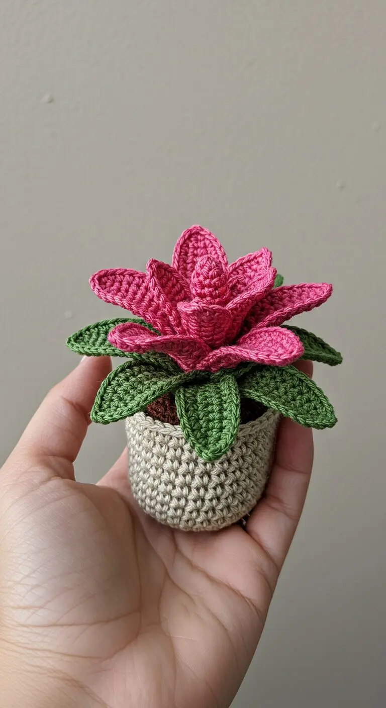 The Bromeliaceae family is known for its striking rosettes and colorful, spiky blooms. In this delightful miniature crochet collection, the bold essence of bromeliads is captured with yarn, showcasing their layered symmetry and vivid hues. These handmade crochet plants bring a lively tropical charm to any setting, offering a long-lasting and low-maintenance way to enjoy one of nature’s most expressive plants.