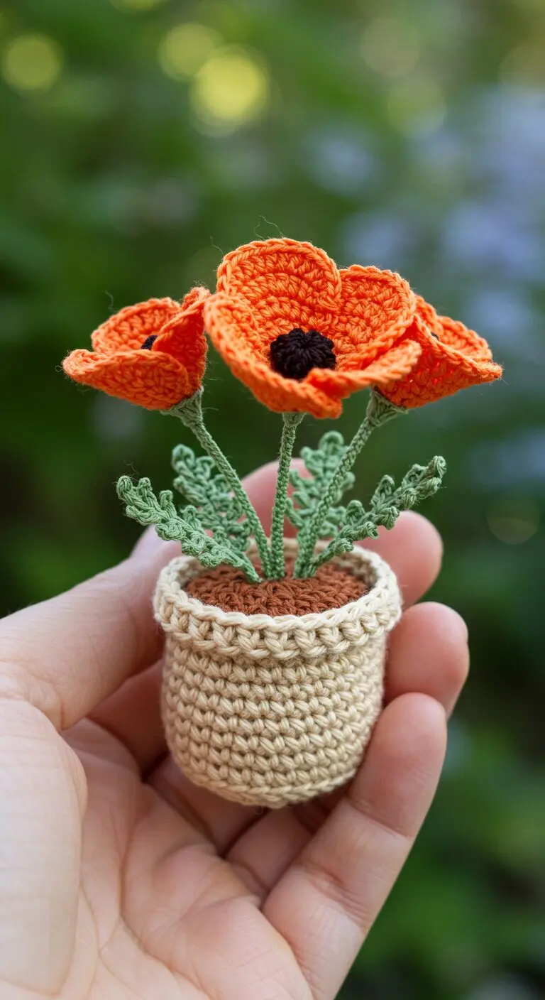 California poppies are known for their bright orange petals and delicate charm. These miniature crochet versions capture the same joyful energy in a lasting and handcrafted form. Carefully placed in small crochet pots, each flower is full of personality and warmth. These crochet plants are a perfect choice for nature lovers, collectors, or anyone who wants to add a pop of color to their home or workspace without the need for watering.