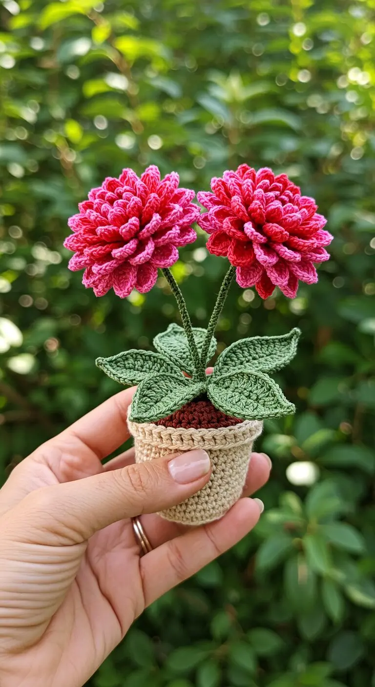 Twin Pink Crochet Dahlia Flowers in Cream Pot