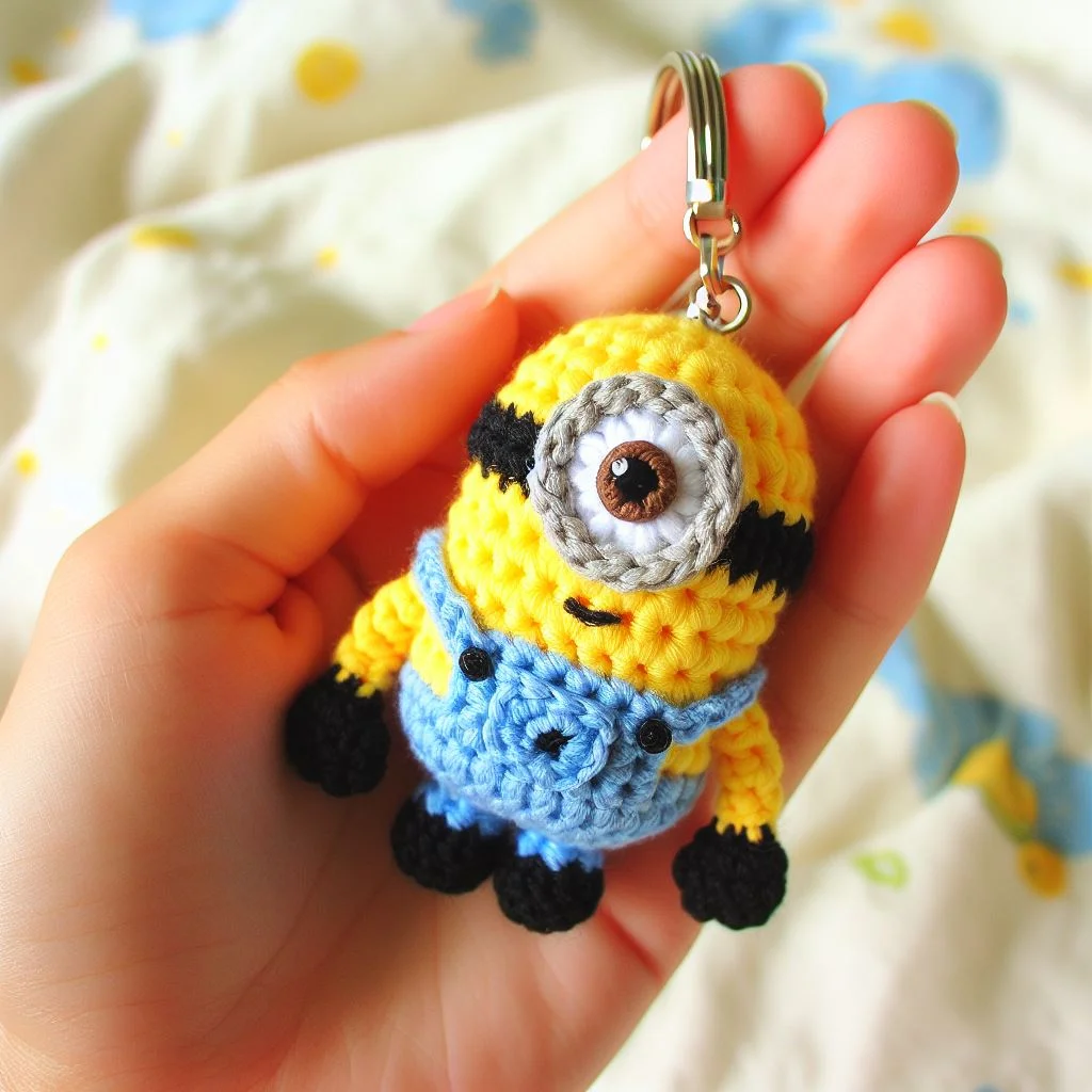 This delightful mini crochet Minion keychain encapsulates the playful spirit of the mischievous characters known from popular culture, all within a compact and cuddly amigurumi design. Sporting the Minion’s signature yellow skin and blue overalls, this handcrafted accessory showcases the joy and creativity inherent in crochet work. The one-eyed Minion is complete with his characteristic goggled eye, bringing a sense of animation and life to the piece.