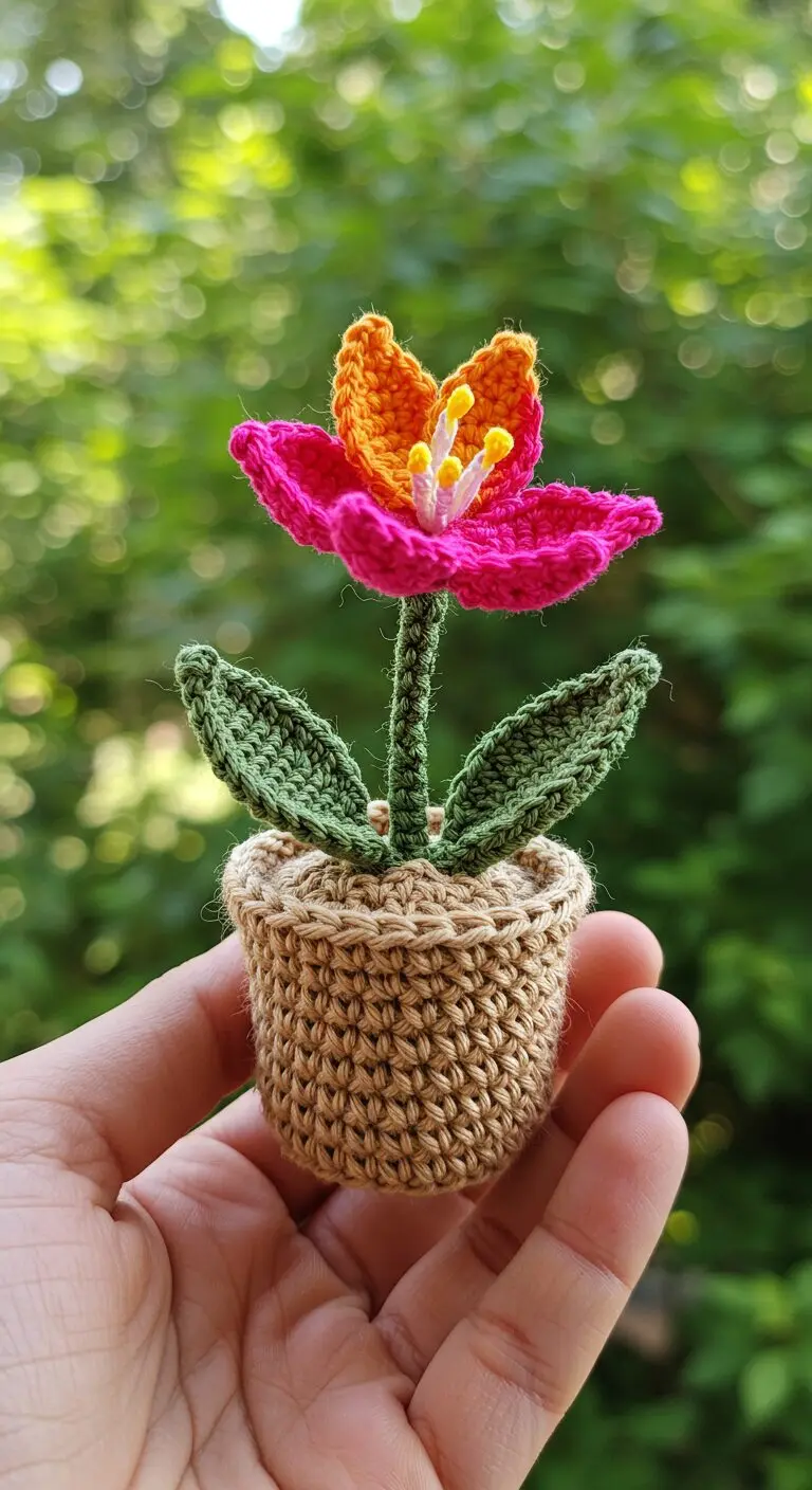 This bold flower combines hot pink and bright orange petals with a yellow center, supported by two deep green leaves in a natural crochet pot.