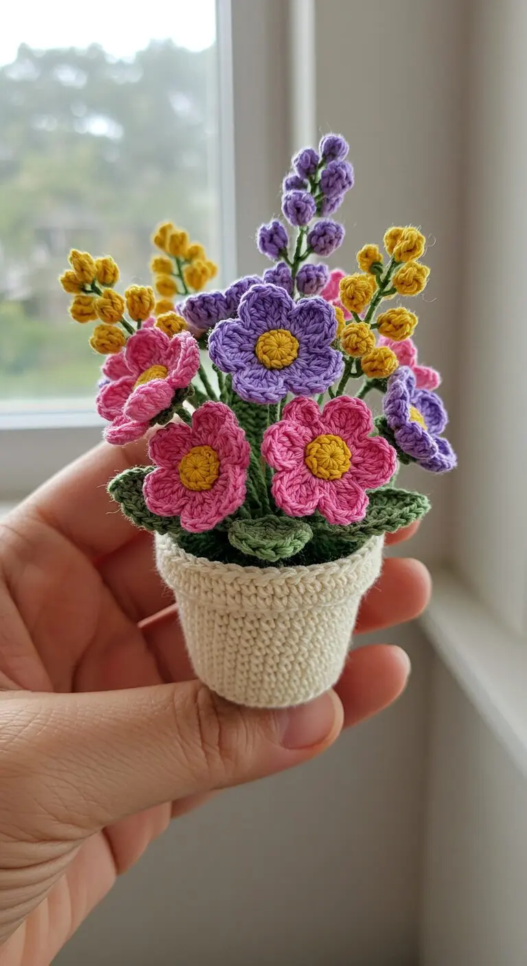 These delightful mini crochet wildflowers are a perfect blend of nature and craftsmanship, bringing color and charm to any interior. Each arrangement is carefully designed with tiny handmade flowers, set in matching crochet pots that elevate their natural beauty. Whether displayed on a desk, shelf, or windowsill, these miniature crochet plants create a lasting floral accent that requires no maintenance but still feels alive and cheerful.