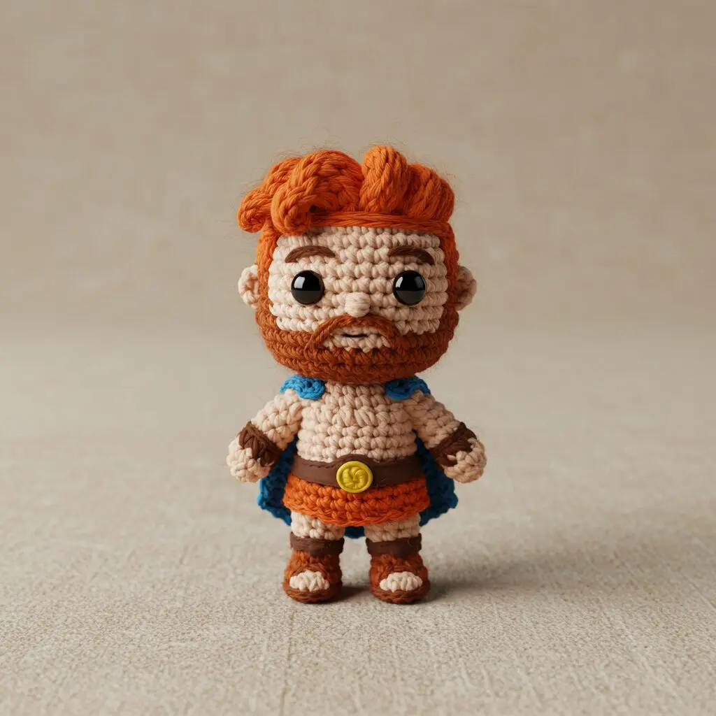 Mini Hercules crochet amigurumi is a charming and powerful addition to any collection of handmade dolls. With his fiery orange hair, heroic beard, and detailed outfit including a blue cape and golden belt buckle, this miniature demigod brings mythological charm to your crochet projects. The Mini Hercules crochet amigurumi pattern is perfect for both fans of Greek mythology and lovers of adorable handcrafted toys.