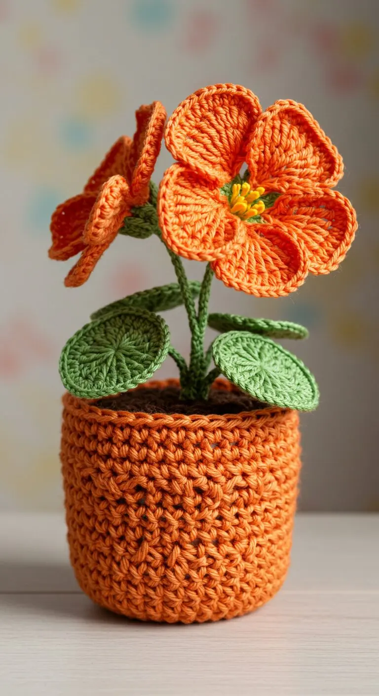 The nasturtium crochet flower is known for its cheerful, trailing beauty and rounded leaves. These handcrafted versions bring the lively essence of real nasturtiums into your home with a soft, whimsical twist. With vivid orange petals and curling stems, each crochet flower pot bursts with charm and playful detail.