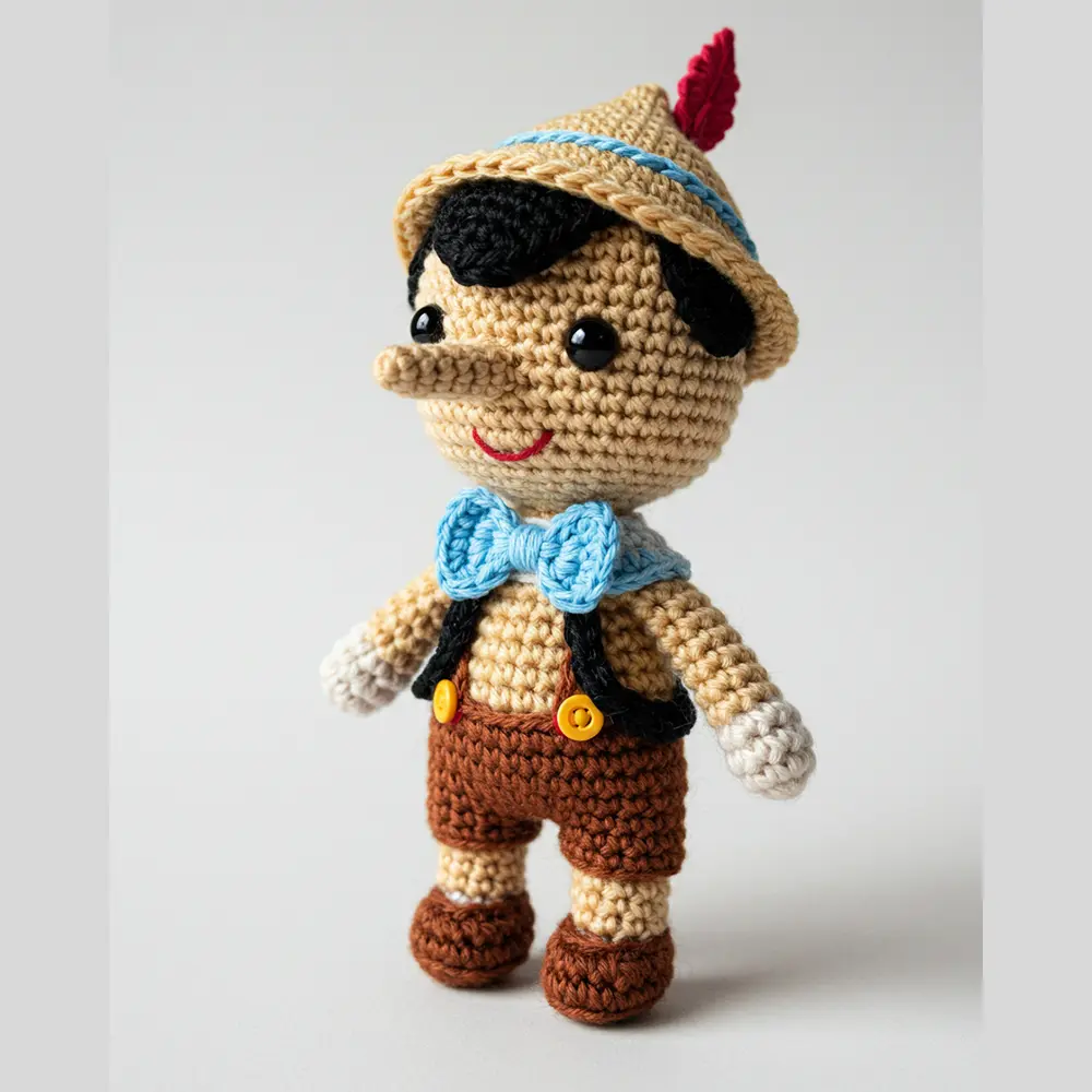 Step into the world of fairy tales with this Pinocchio amigurumi! This adorable crochet doll features Pinocchio’s classic outfit, including his blue bowtie and iconic hat.
