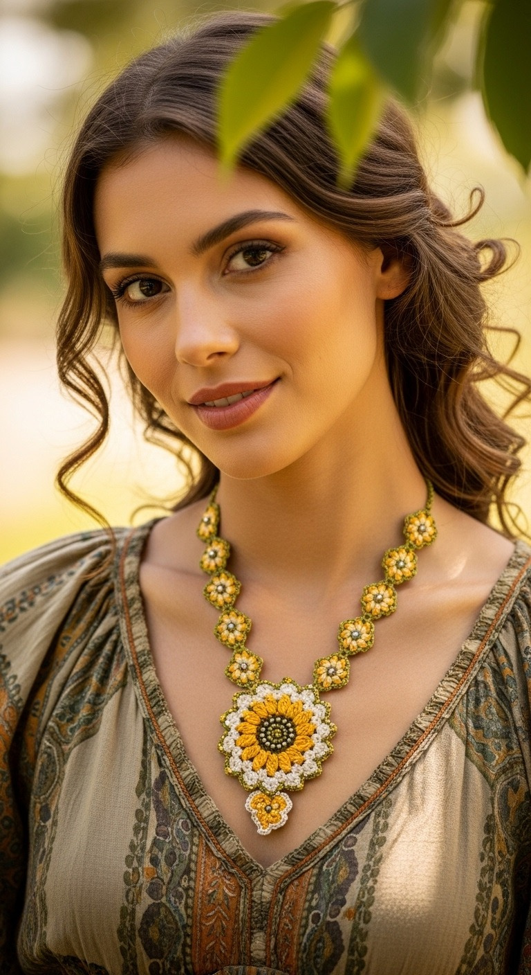 Immerse yourself in the art of crochet and create a truly unique accessory that reflects your personal style. This radiant sunflower necklace offers a blend of intricate detail and vibrant color, perfect for adding a touch of bohemian elegance to any outfit. Handcrafting this piece allows for a custom fit and the satisfaction of wearing a one-of-a-kind creation.