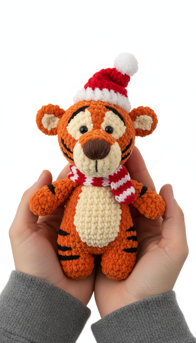 Get ready to crochet the most adorable holiday companion with this detailed pattern for a Festive Striped Amigurumi Tiger! Perfect for adding a touch of handmade charm to your Christmas decor or gifting to a loved one, this tiger sports a cute Santa hat and a festive striped scarf.