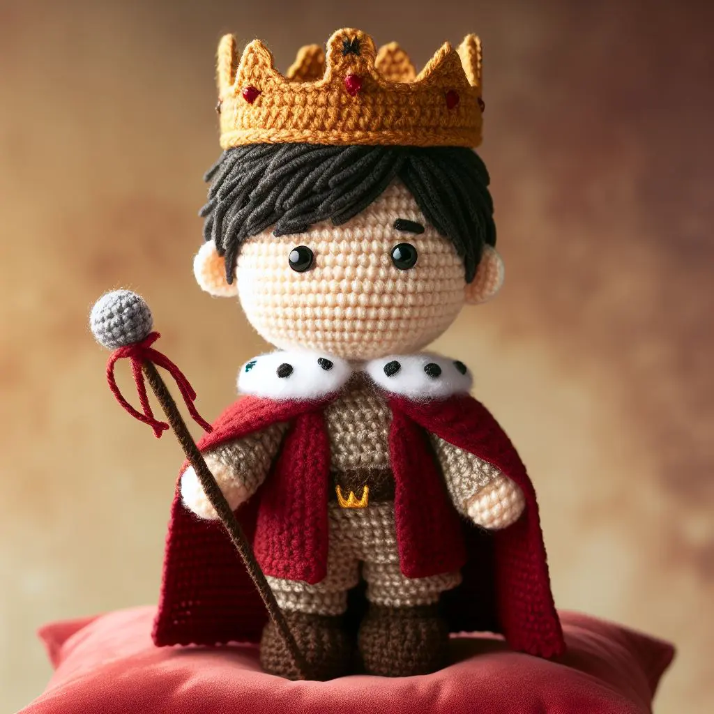 Behold the Royal Amigurumi King, a crochet masterpiece that exudes nobility from every meticulously crafted stitch. The regal bearing of this amigurumi is immediately apparent, standing proudly with a golden crown atop its head, each point adorned with a small, crimson bead representing rubies. The king’s face is characterized by a soft, peach-toned yarn, giving a gentle contrast to the dark brown of his carefully crocheted hair, resembling a short, modern hairstyle. His eyes, two emerald green beads, are set with precision, adding a spark of life and benevolence to his visage.