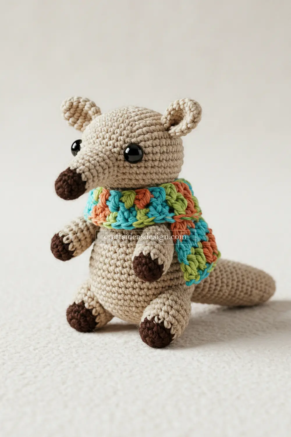 This Anteater amigurumi, complete with a colorful scarf, is a cuddly and cheerful creation. It stands out with its warm palette and adorable posture.