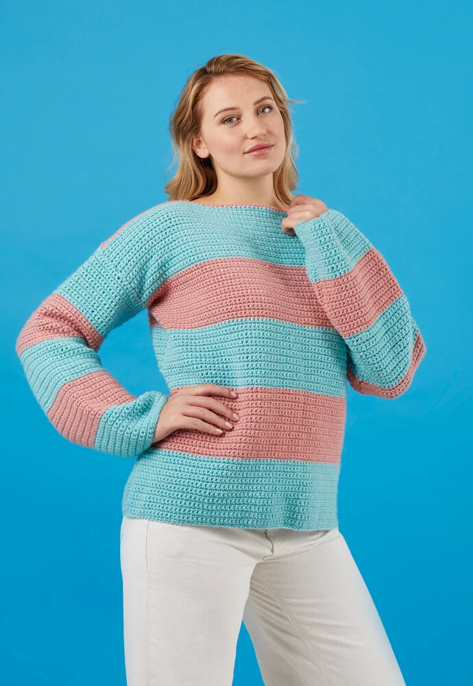 If you’re looking for an easy sweater pattern that you can wear in no time, look no further! This striped sweater is perfect for crocheter beginners making their first garments or master crocheters looking for a quick project that can be done in a week. In the Paintbox Yarns 100% Wool Chunky Superwash, it’s the perfect garment for when the inevitable spills happen without the stress of washing hand linens!