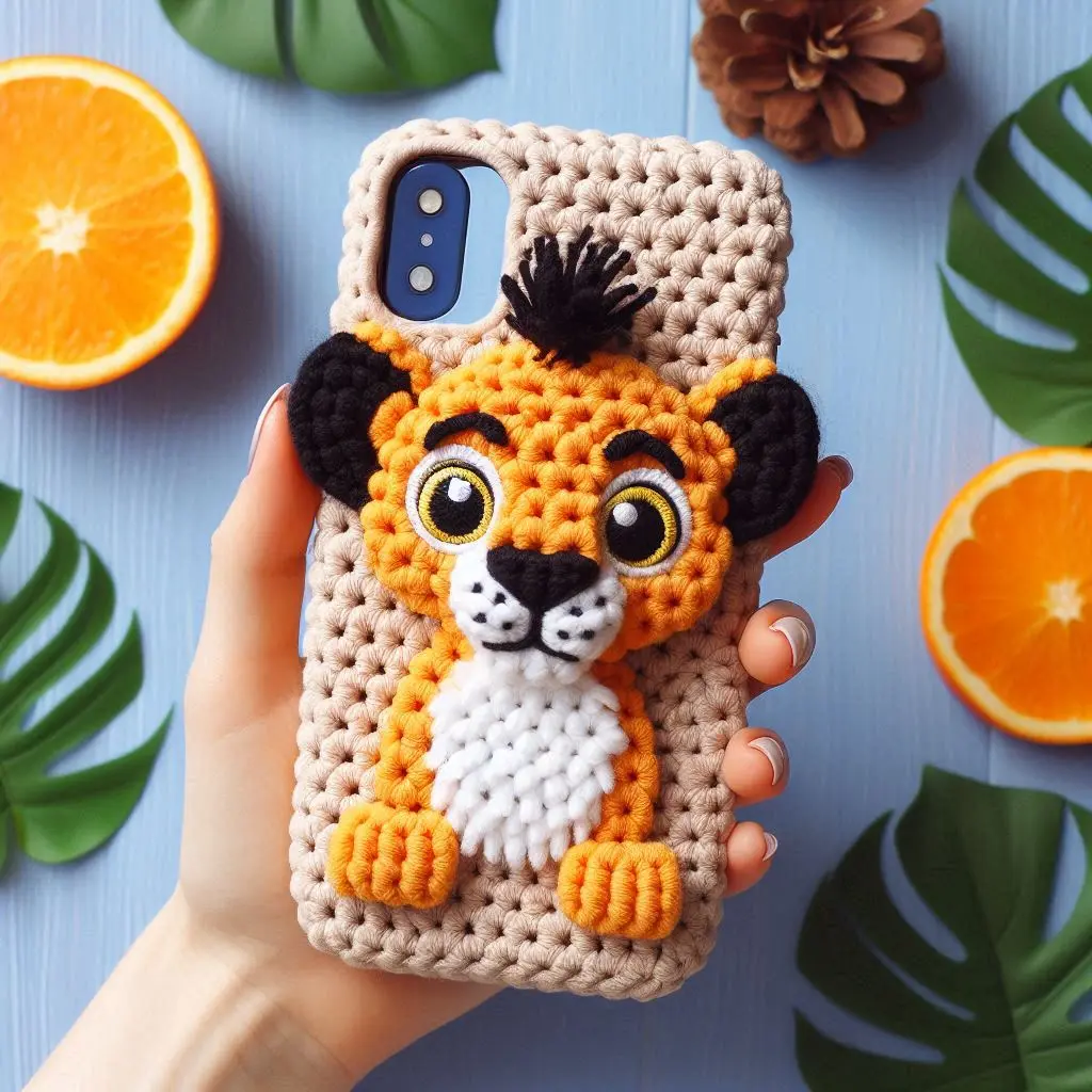 Inspired by The Lion King, this crochet phone case features a charming depiction of young Simba, radiating his adventurous and courageous spirit. His golden fur, fluffy mane, and expressive eyes make this design irresistibly cute. The neutral beige background allows Simba to be the star of the show, making this case a true tribute to the beloved Disney classic.