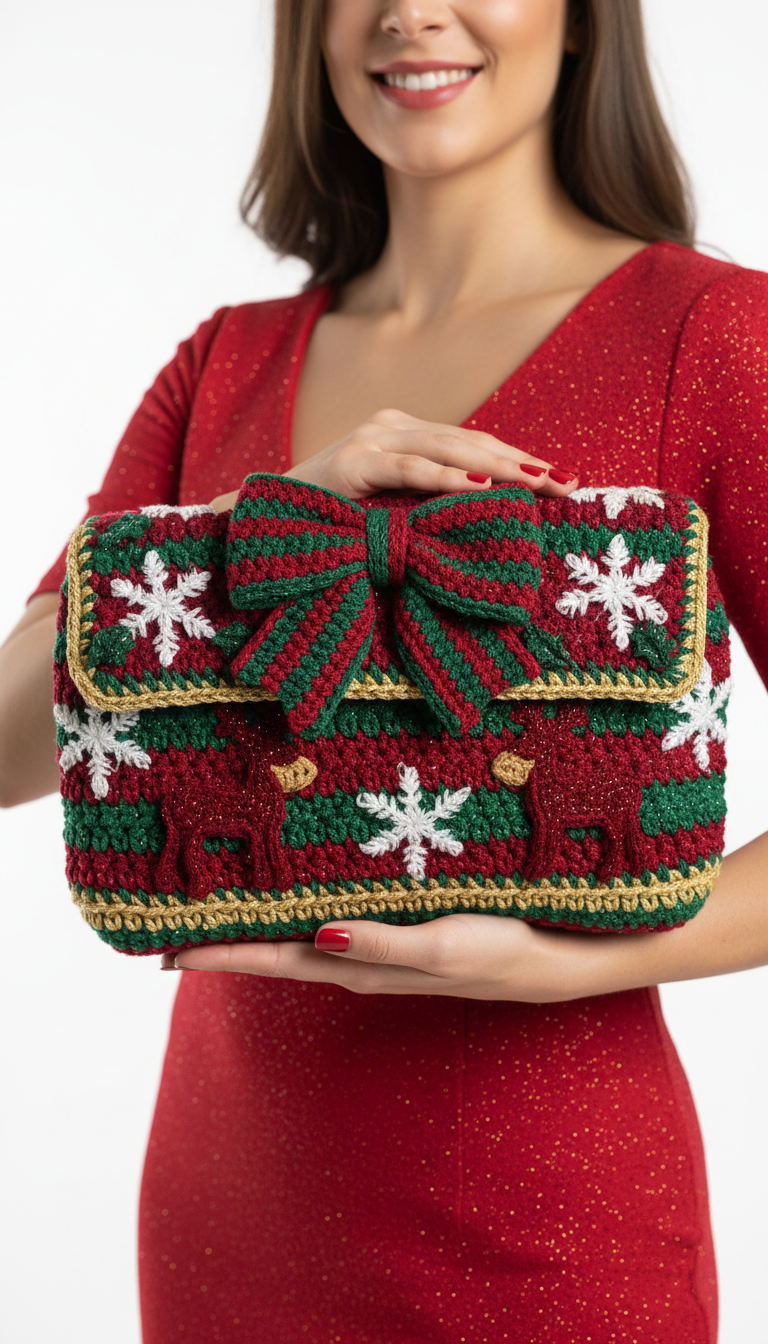 Get ready to spread holiday cheer with this stunning Christmas Crochet Clutch! Featuring festive red and green stripes, delicate white snowflakes, and charming reindeer appliques, this handmade bag is the ultimate accessory for any festive gathering. It’s perfect for carrying your essentials or as a unique, thoughtful gift for someone special.