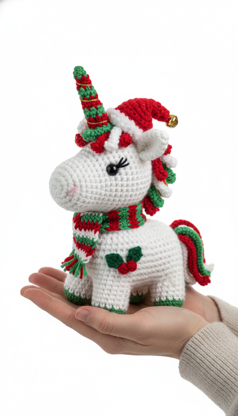 Bring a touch of holiday magic to your home with this enchanting Christmas Unicorn Amigurumi! Perfect for festive decorating or as a thoughtful handmade gift, this pattern guides you through creating an adorable plush unicorn adorned with a tiny Santa hat, a cozy striped scarf, and charming holly details. Get ready to crochet your way to a season filled with sparkle and joy!
