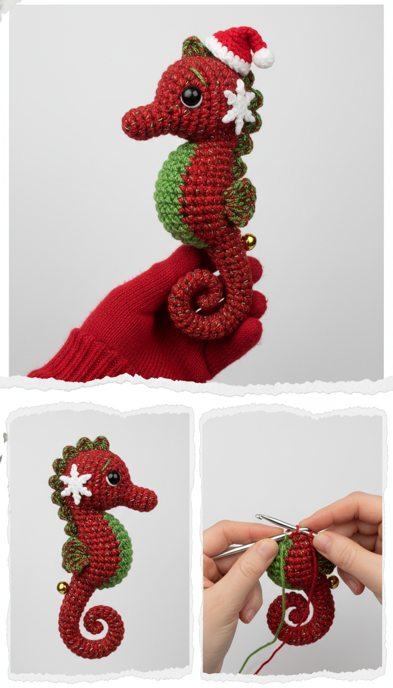 Dive into the festive season with our sparkling Christmas Seahorse Amigurumi pattern! This enchanting marine friend, adorned with a tiny Santa hat and snowflake, brings a unique touch of holiday cheer to your home. Perfect as a charming ornament or a delightful gift, this pattern guides you through creating your very own whimsical seahorse in shimmering red and green.