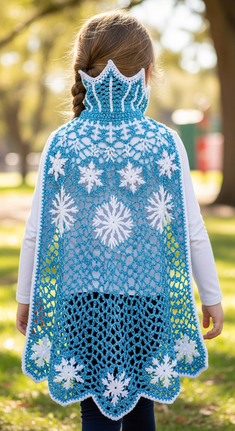 Transform playtime into a winter wonderland with this enchanting Sparkling Crochet Snowflake Cape! Perfect for little ones who dream of ice castles and frosty adventures, this cape features a shimmering blue body, a regal crown-inspired collar, and delicate white snowflakes. It’s a magical accessory that will spark endless imaginative fun and make any child feel like royalty.